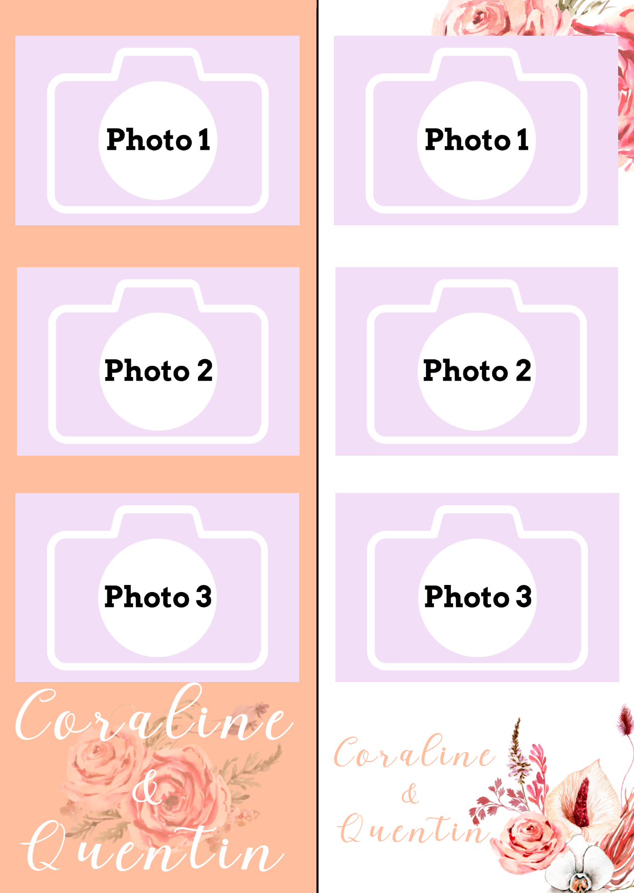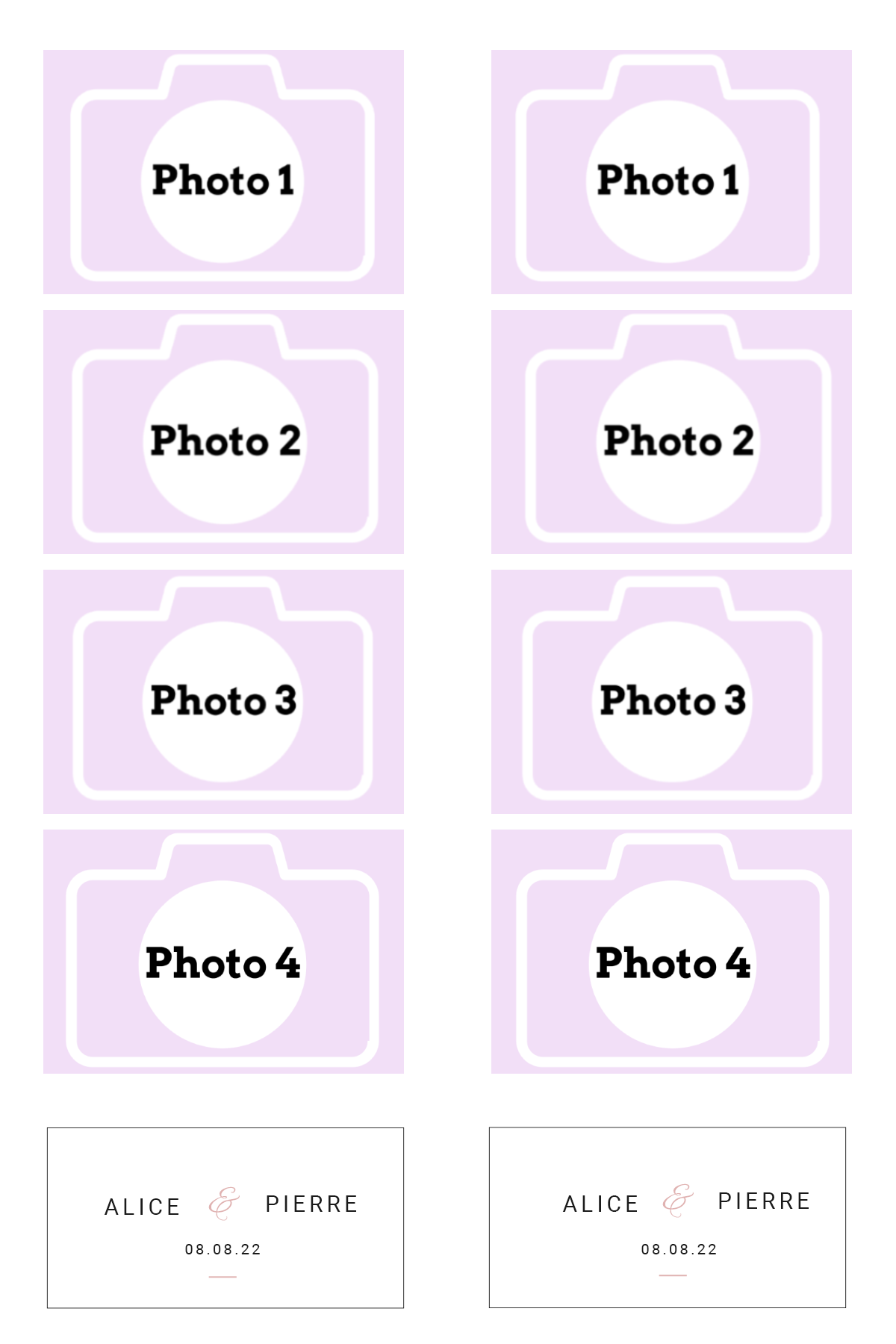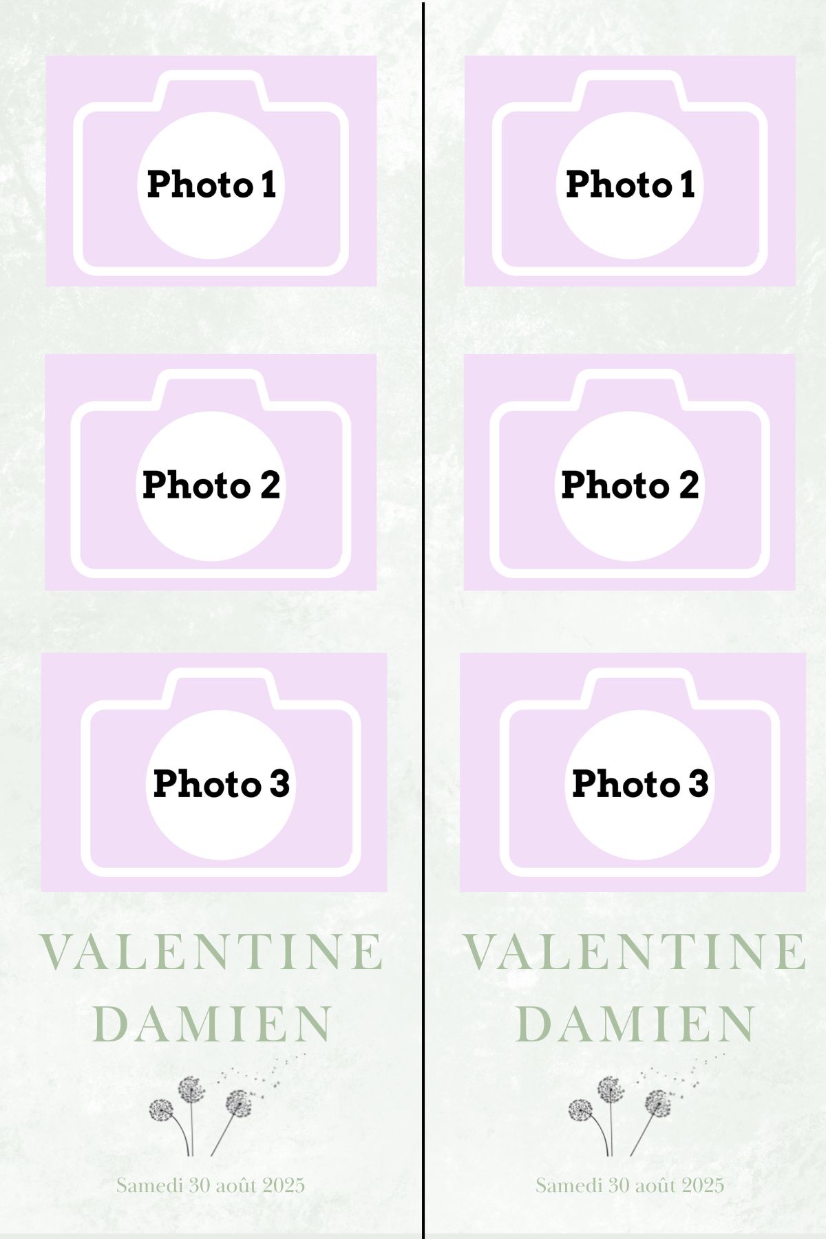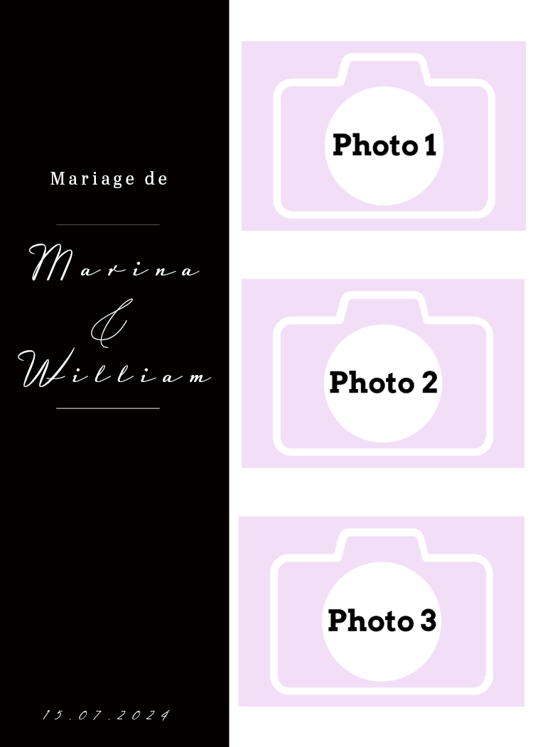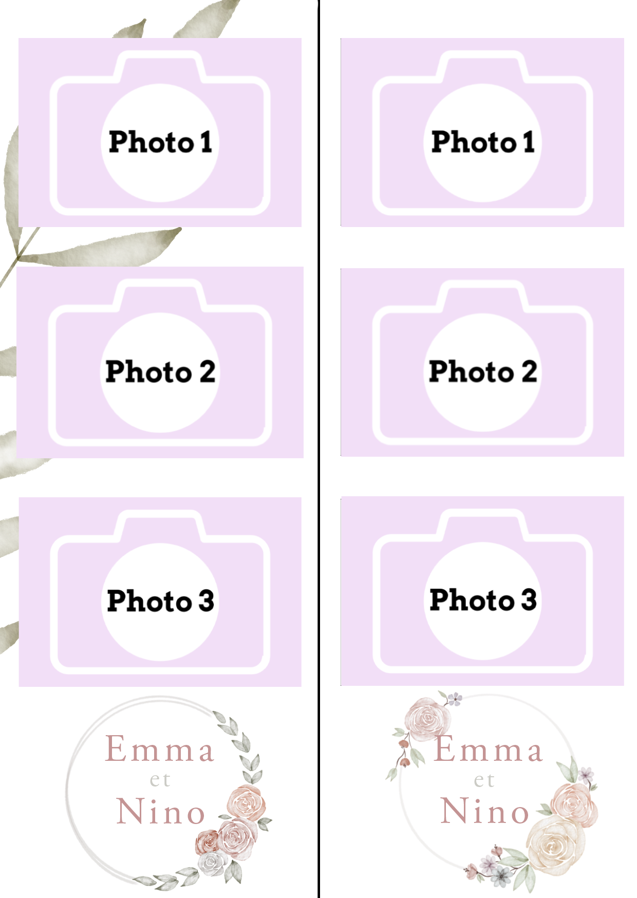 - Laisser nous concevoir votre mise en page grâce à l’option « déléguer ma mise en page » Chaque mise en page est modifiable ( texte, couleur…) il vous suffira juste de m’informer des modifications souhaitées lors de votre réservation dans l’espace dédié.