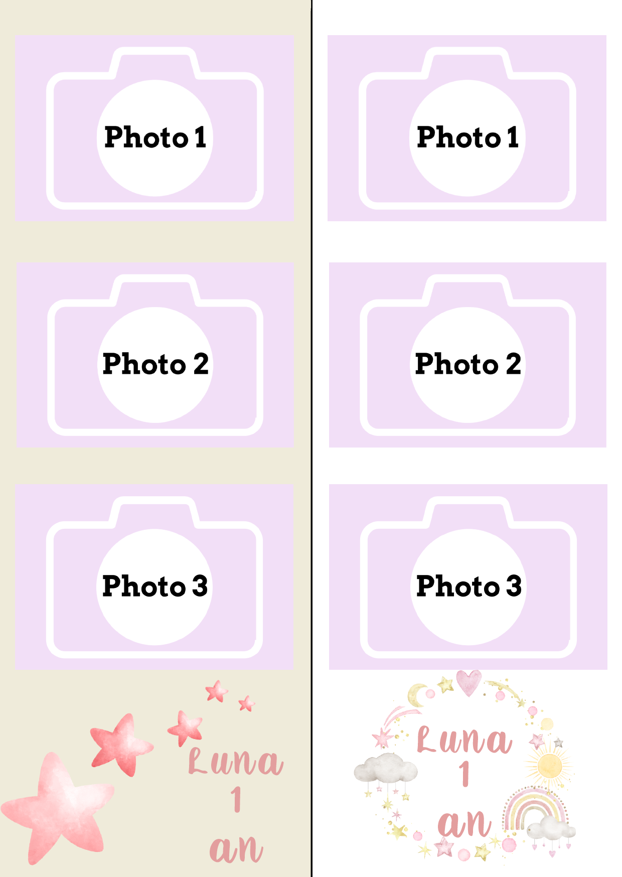 - Choisissez une mise en page sur notre catalogue ci-dessous (envoyez nous par mail jelaisse.mapetiteemprint@gmail.com la photo de la mise en page sélectionnée avec le/les textes à modifier. Certaines couleurs peuvent être modifiées à la demande)